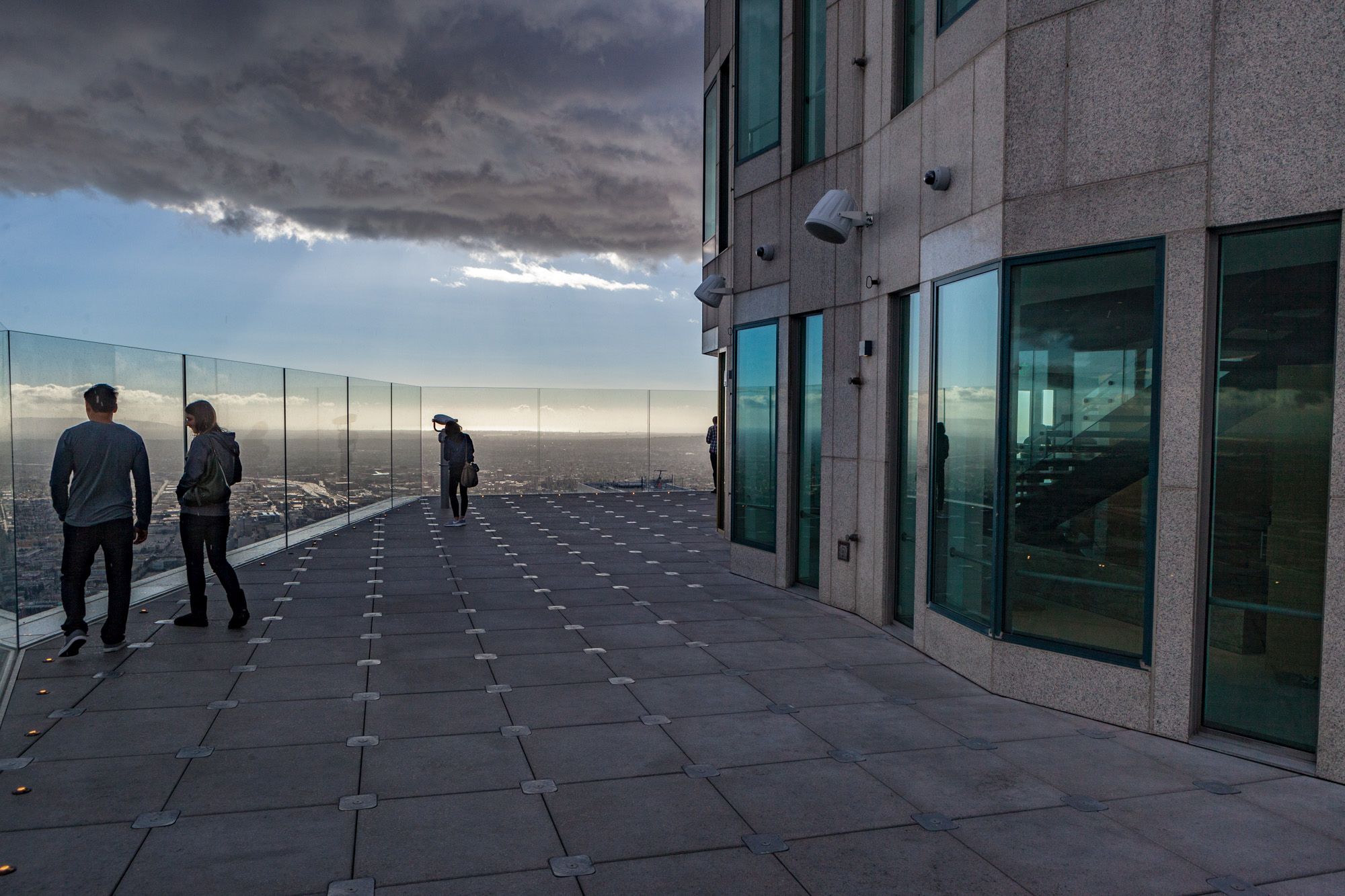 There are two observation terraces with glass walls all the way around. The inside two levels feature a little snack bar and interactive screens to learn at what you are actually looking at. On the lower level is also the photo booth where you can pick up your picture taken on the 54th floor and when you came down the skyslide.