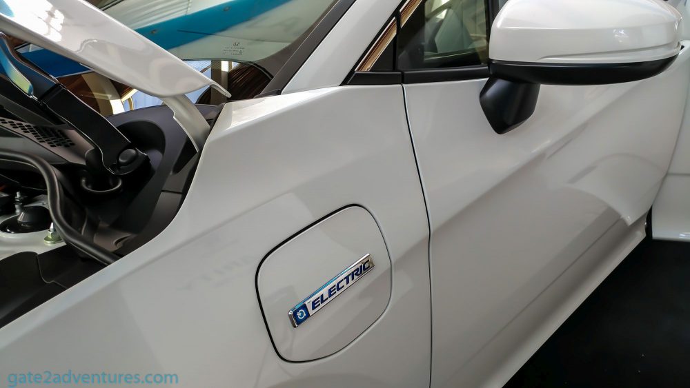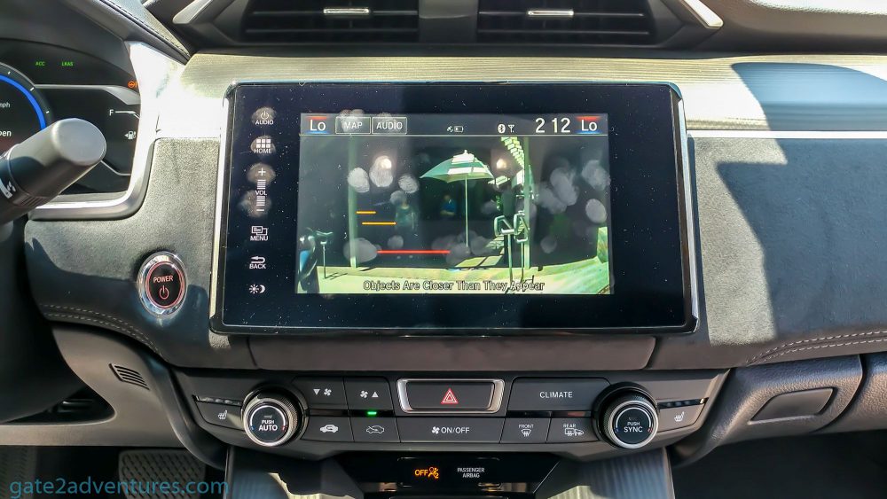 Most of the functions and settings are accessible by the steering-wheel controls and the two handles on either side of the steering wheel. This allows adjustment of the most used settings without ever taking your eyes off the street. Speaking of taking the eyes of the street, the Clarity Electric is loaded with safety features to assist the driver. Honda calls them Honda Sense which includes Collision Mitigation Braking System (CMBS), Road Departure Mitigation System (RDM), Adaptive Cruise Control (ACC), Lane Keeping Assist System (LKAS). These systems are supported by a camera mounted under the right mirror and comes on when you use your turn signal to have a better view of the right-side blind spot of the car. The image is displayed in the main 8″ display in the center of the car. Additionally, you can switch on the camera manually via a button on the lever on the steering wheel. The camera will stay on even when you drive and shows what happens on your right side in the center display.