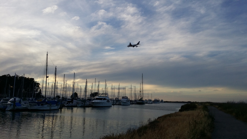 This spot gives you an unobstructed view of the planes coming in from the south over the San Mateo Bridge and heading towards SFO. From here you get to see all the traffic landing on 28L and 28R. These two runways get used by big planes like the A380. The Yacht Harbor can work as a great background for the photos of the planes. A big zoom lens is also required here to get frame-filling shots of a plane.