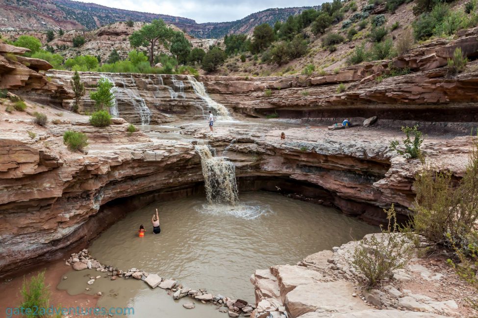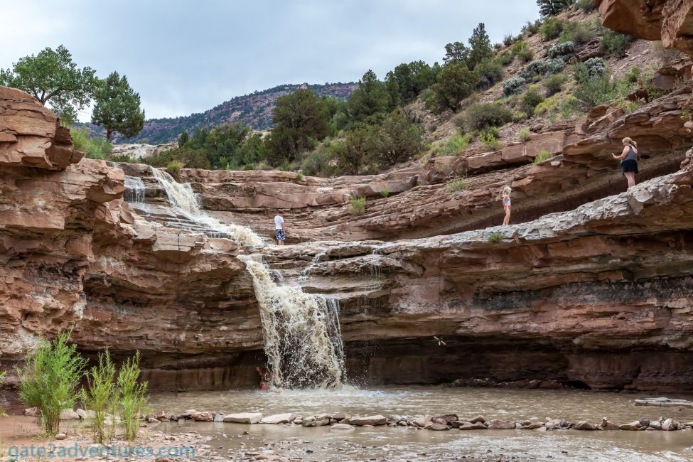 Toquerville Falls is a great and beautiful two-stage waterfall. La Verkin Creek feeds the waterfall and runs into the Virgin River just southwest of Saint George. The waterfall carved an amazing swimming hole at the bottom section of the falls. There used to be a wooden ladder from the swimming hole up the little-elevated platform but this one is gone. You can still see it on older pictures. At the same spot is now a rope with climbing loops to climb up there.