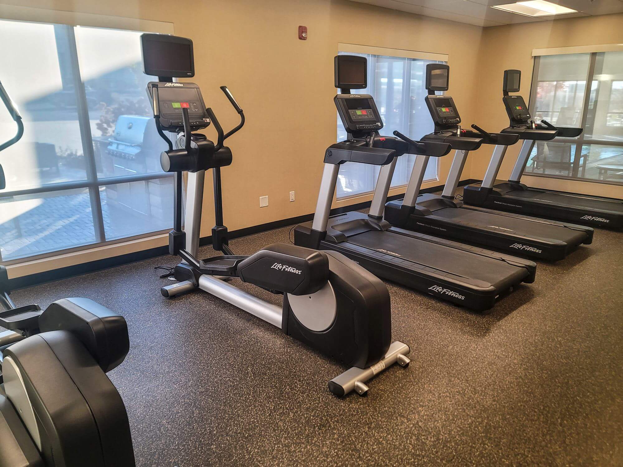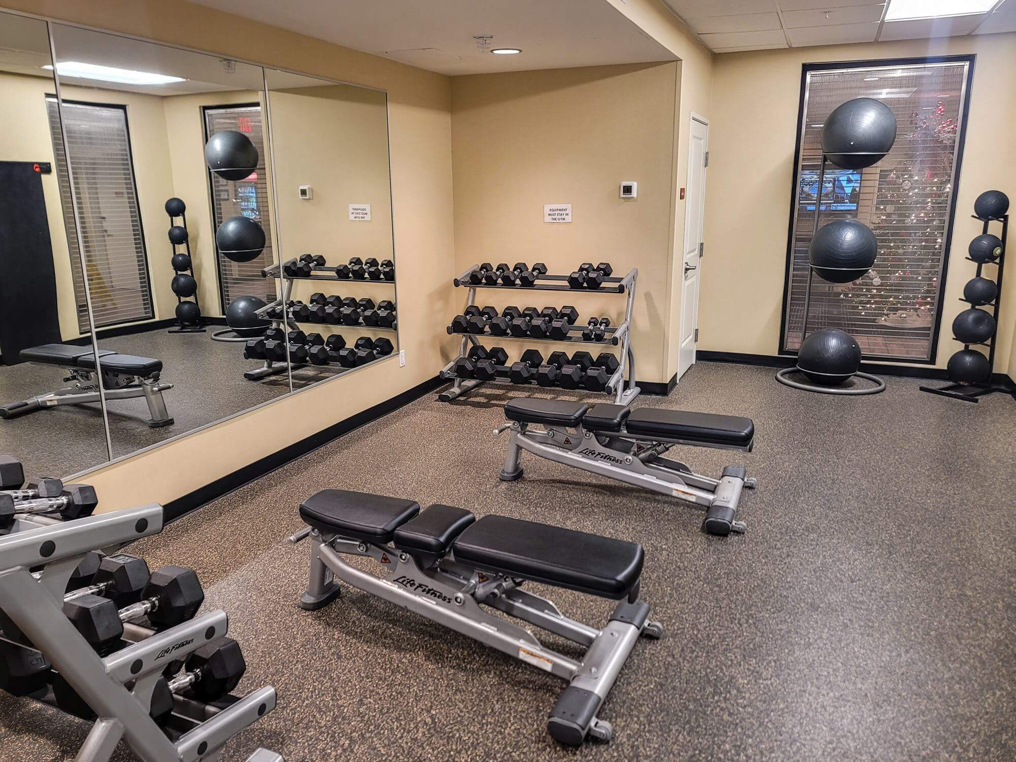 The fitness center is located on the opposite side of the building from the main entrance. It has a good selection of workout equipment.