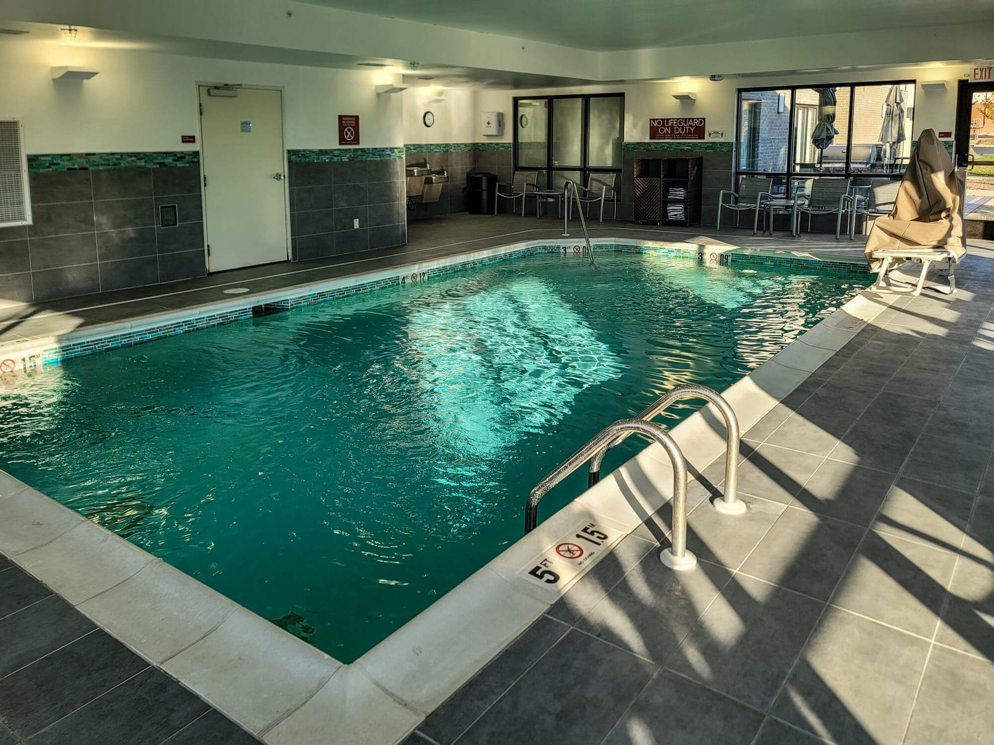 There is an indoor pool at this property. The hotel’s pool area is very spacious and has lots of windows for a brighter experience throughout the day. There are a few chairs and pool loungers in the pool area.