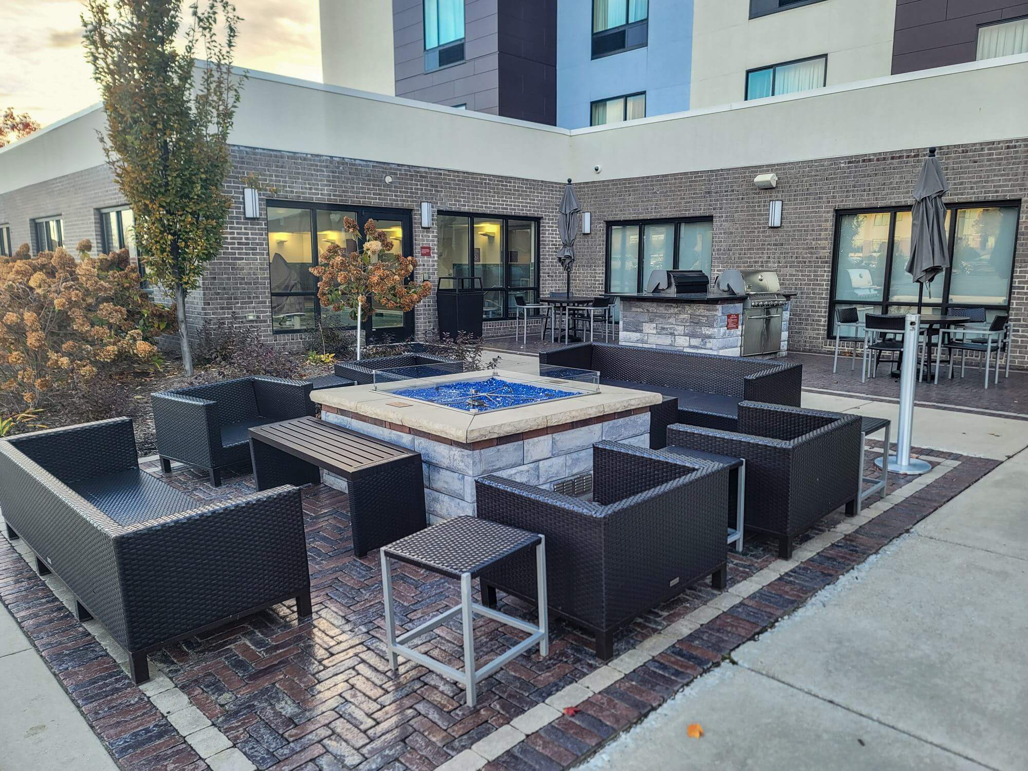 Outside is a patio area with a fireplace and seating options around it. There is also a BBQ grill on the patio which is complimentary to use for hotel guests.