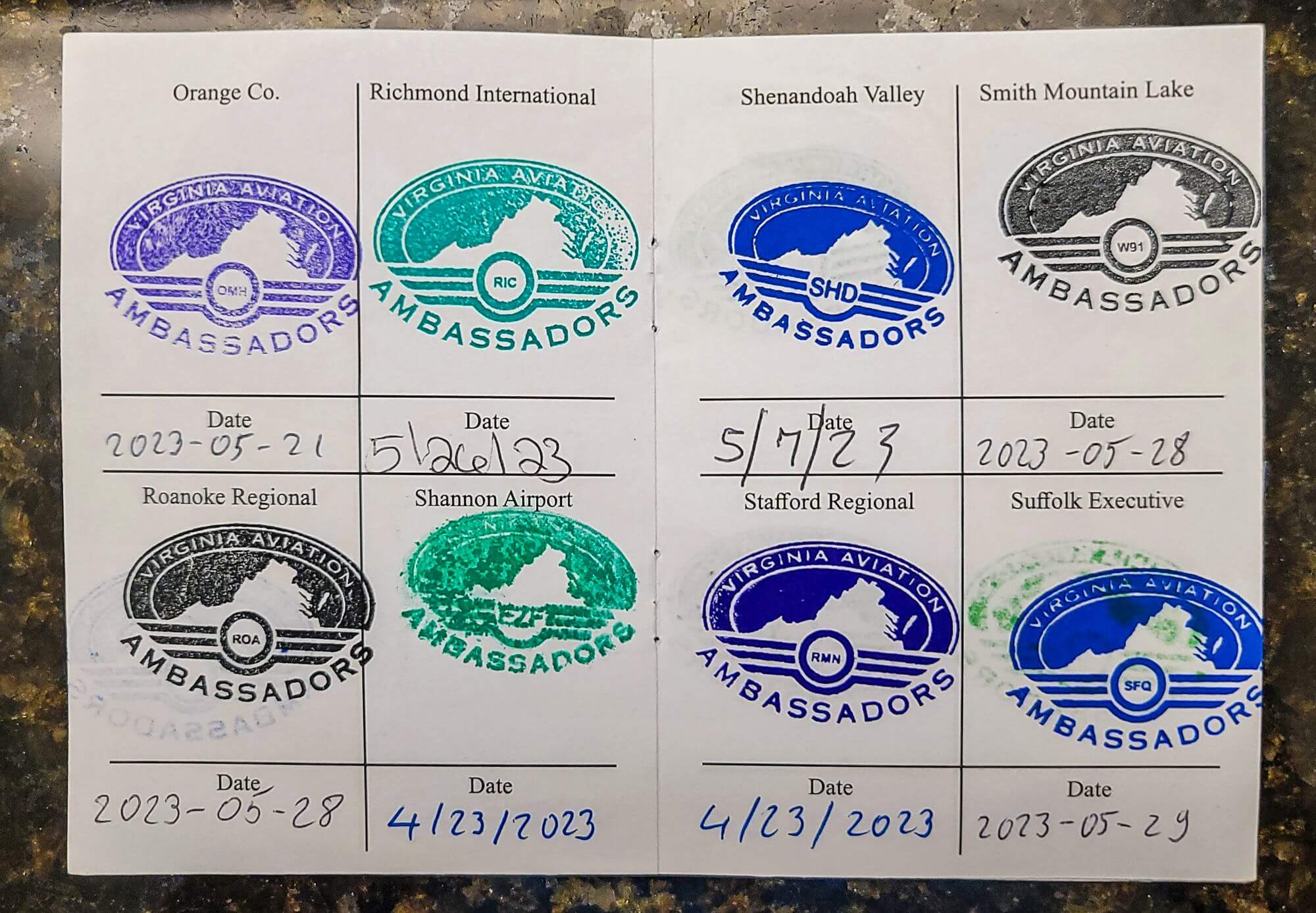 I was at Ronald Reagan National Airport in D.C. and went to the info counter of the terminal to collect their Airport Trading Card. The volunteer I talked to didn’t know at first what I was looking for and he told me he knew about the stamp they had. This sparked my curiosity and I asked him to tell me more about this. He didn’t know much, just the name of the program and that you need a passport which gets stamped. While looking to see if he had passports, he also found the trading cards for DCA. After I got back to the hotel, I googled for the Virginia Aviation Ambassador Program and found it quickly. I emailed them via the contact information on their website, and they were so grateful and mailed me a passport right to my hotel in D.C.